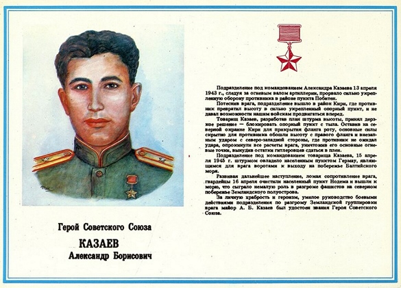 Выпускник пехотного училища во Владикавказе, фамилию которого в документах записали как КАЗАЕВ, на фронтах Великой Отечественной войны – с сентября 1941 г. Отличился при освобождении Крыма. Акварельный портрет отважного сына Осетии (художник И.Доценко) хранится в краеведческом музее г. Саки Республики Крым. Завершил войну в Польше.