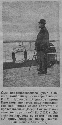 В 1926 г. в журнале «Огонёк» появилась фотография мужчины в котелке и с тростью, стоящем на борту океанского лайнера. Подпись под фотографией гласила: «Сын владикавказского купца, бывший монархист, инженер-технолог И.С. Проханов в данное время является вице-президентом Всемирного союза баптистов и председателем Всероссийского союза евангелистских христиан. Заснят на пароходе во время поездки в Америку (Америка – центр и денежный мешок баптистов)».